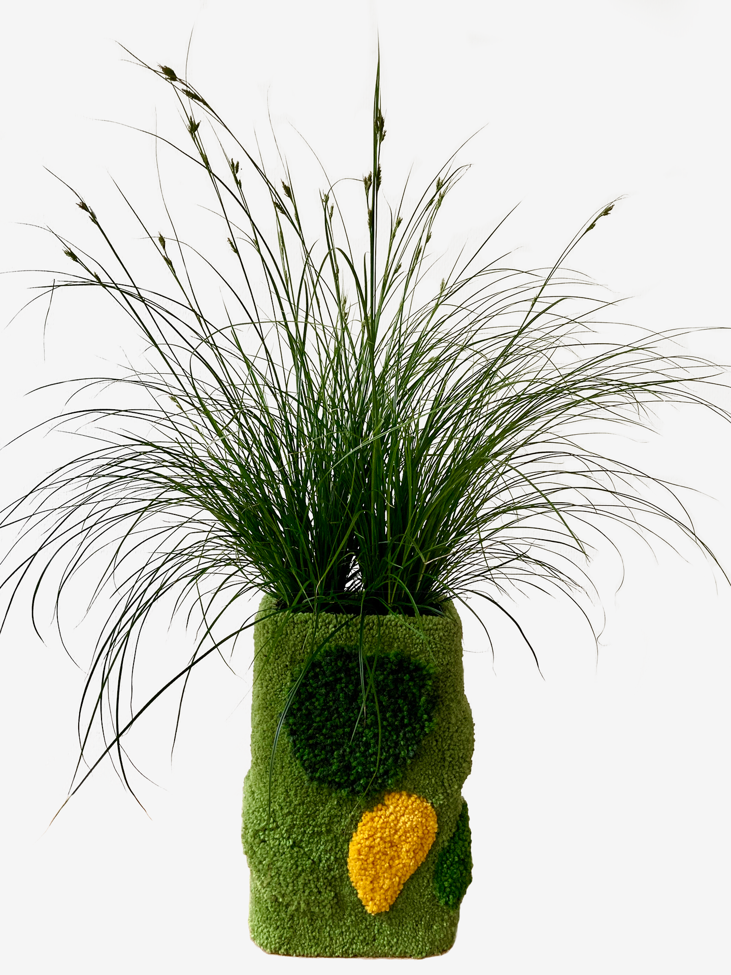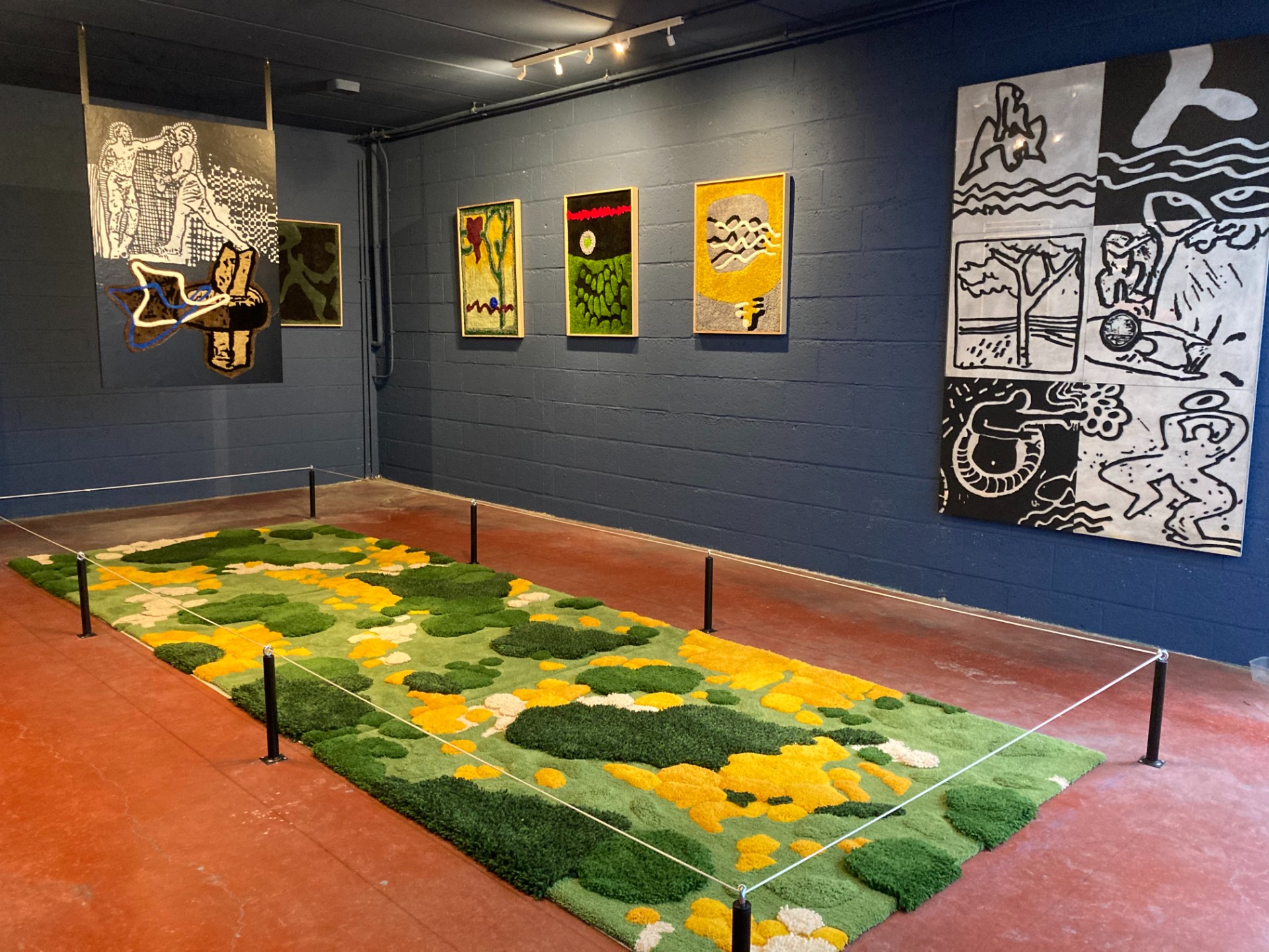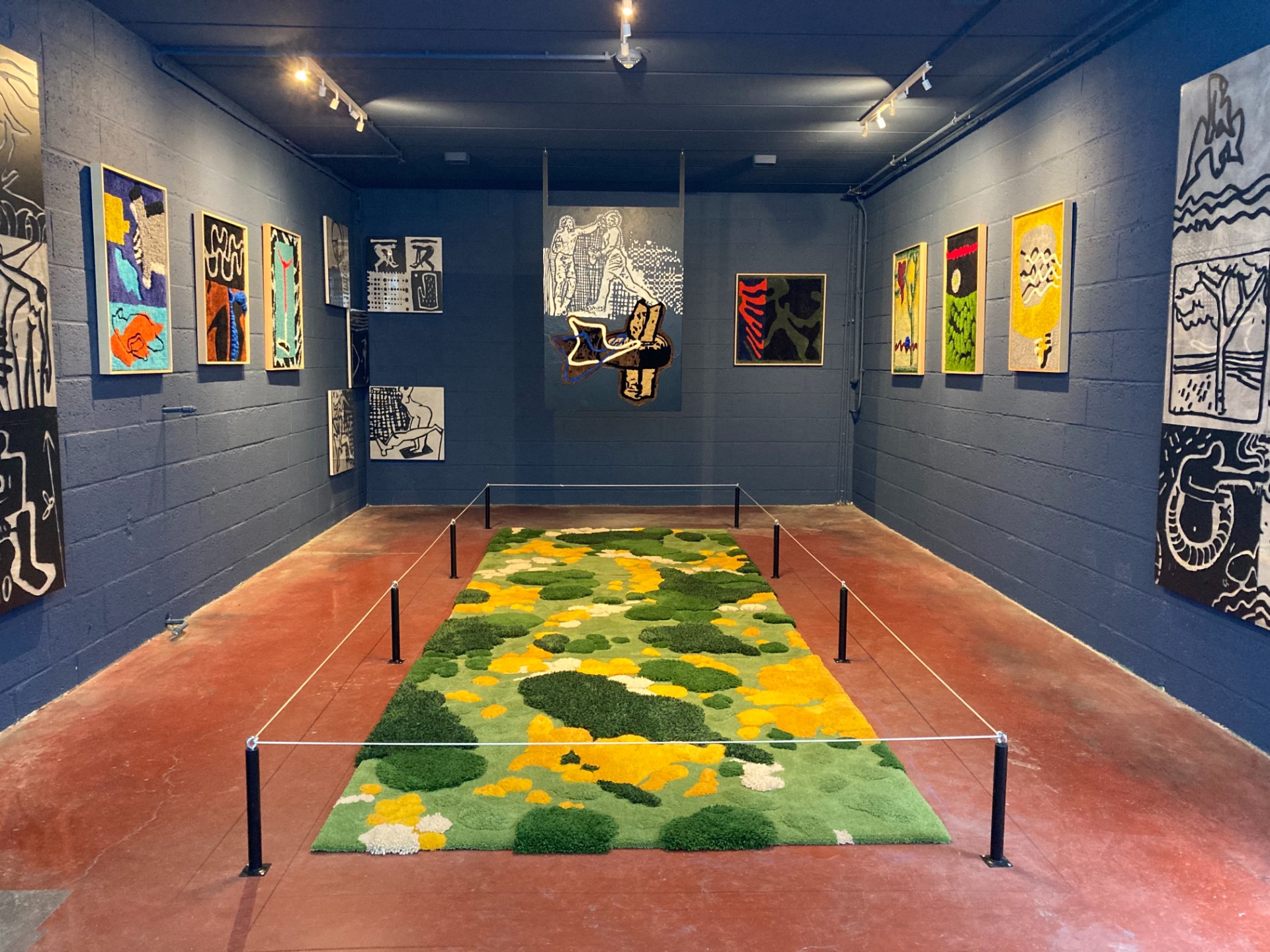 À l’occasion de la neuvième édition de FuelBox, nous présentions une installation où illustration et tufting dialoguent dans un espace entièrement repensé. Nous avons peint les murs d’un bleu profond pour créer une atmosphère enveloppante, presque souterraine, propice à la contemplation. Au sol, une série de tapis évoquant herbes, mousses et textures végétales invitaient à une immersion sensorielle. Un paysage textile à parcourir du regard ou du pas, en écho aux œuvres suspendues aux murs.