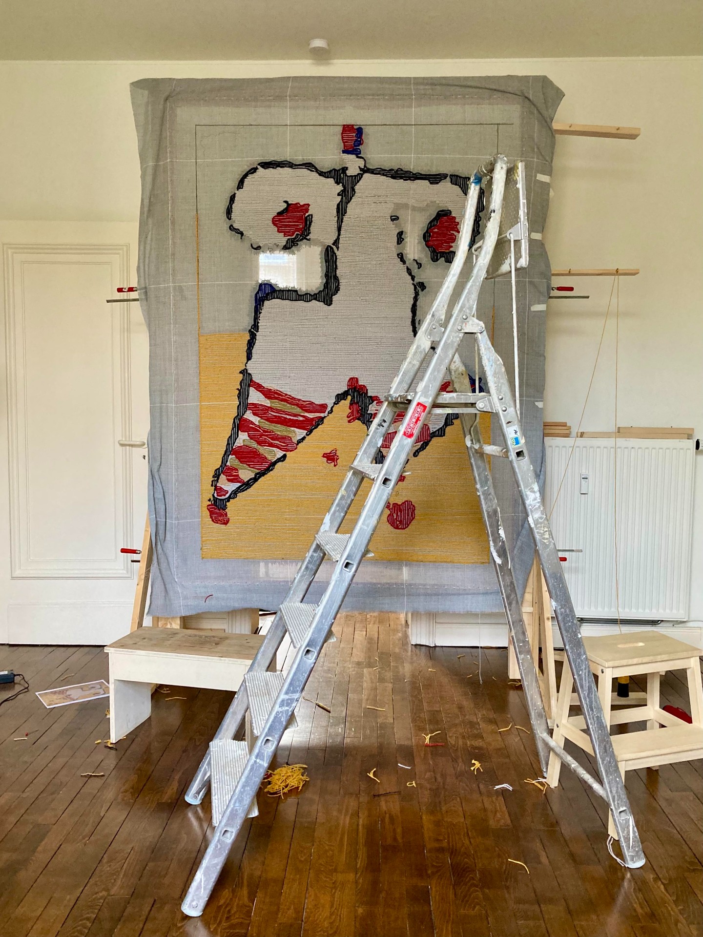 À l’invitation de Kit Graas, le duo LUGI réinterprète une œuvre de Gust Graas en tapis tufté. En transposant gestes et couleurs de la peinture vers la laine, la pièce fait vibrer autrement la lumière et la douceur au cœur de l’univers de Graas, en dialogue direct avec l’original présenté à côté.